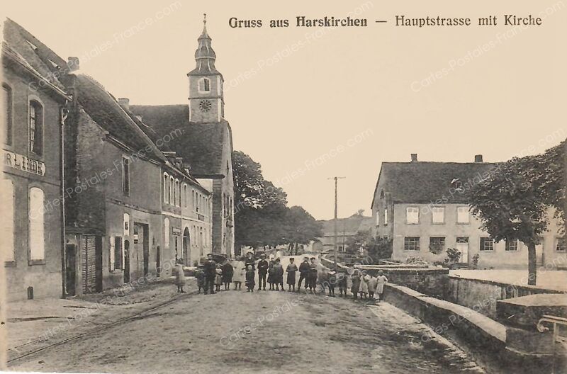 Salutations de Harskirchen-rue principale avec église